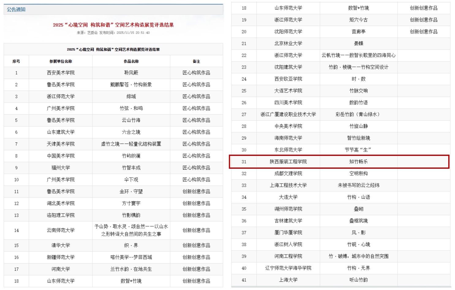 2025 年,“心境空间,构筑和谐”空间艺术构造展览于浙江省金华市建筑艺术公园盛大开幕。此次展览吸引了全国 56 所高校参与,从前期收到的 140 件投稿作品中,遴选出 58 组入围。我院师生团队创作的构造作品《知竹畅乐》历经严格筛选,成功入围全国终展,并已在展览现场顺利完成搭建与展示。