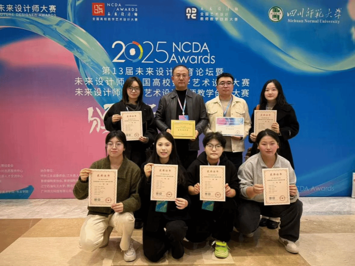 2025年11月22日至24日,第十三届未来设计教育论坛暨2025未来设计师系列赛事颁奖典礼在成都举办。活动由工业和信息化部人才交流中心、未来设计师大赛组委会、四川师范大学联合主办,汇聚全国设计教育界专家与高校代表,搭建了高水平学术交流与成果展示平台。Bwin·必赢执行院长时晓楠带领师生代表应邀参会,时晓楠院长以行业资深专家身份担任颁奖嘉宾,为NCDA全国总决赛一等奖获奖学生代表颁发荣誉;学院师生凭借深厚专业积淀与创新设计理念,在大赛中斩获12项全国大奖。