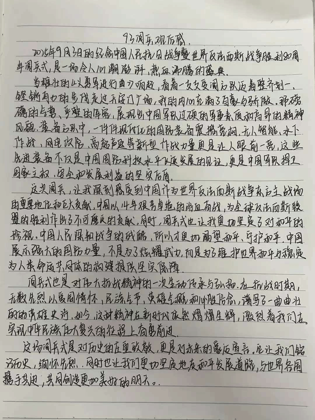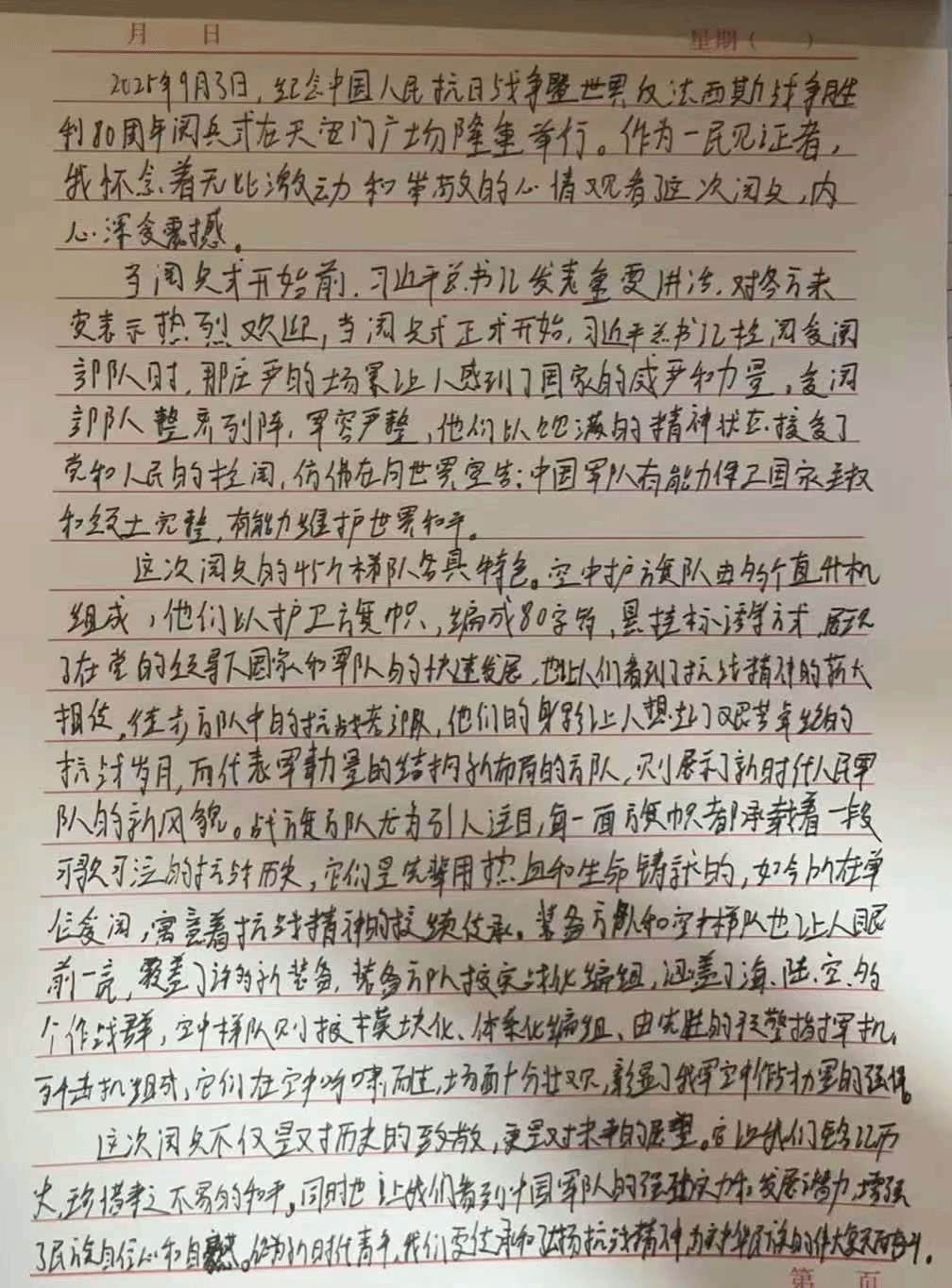 直播观看现场,气氛庄重而热烈。雄壮的国歌声响起,全体同学自发肃立,齐声高唱。当受阅部队迈着铿锵有力的步伐、以排山倒海之势通过天安门广场时,当各类现代化武器装备震撼亮相时,当空中梯队呼啸掠过苍穹时,教室里多次爆发出热烈的掌声和由衷的赞叹声。同学们全神贯注,深切感受到人民军队的威武雄壮和国家实力的日益强盛,民族自豪感油然而生。