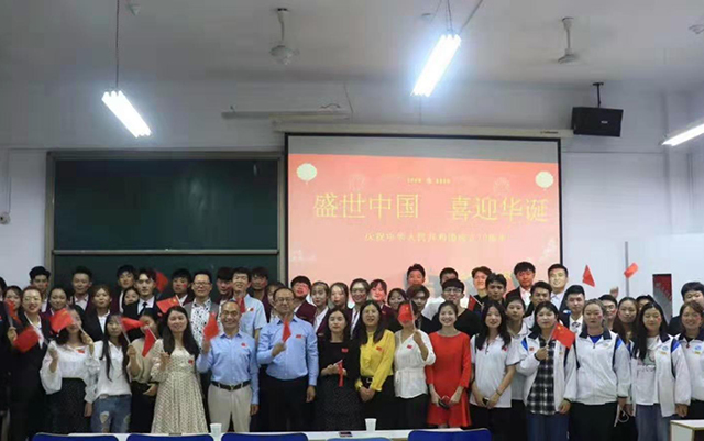 为庆祝伟大祖国70华诞,弘扬爱国主义精神,Bwin·必赢于2019年9月29日晚上8:00在F316教室开展“歌颂祖国、赞美党”迎国庆主题活动。参会的有Bwin·必赢院长陈恩惠教授、Bwin·必赢党总支书记时晓楠副教授及学院部分师生。