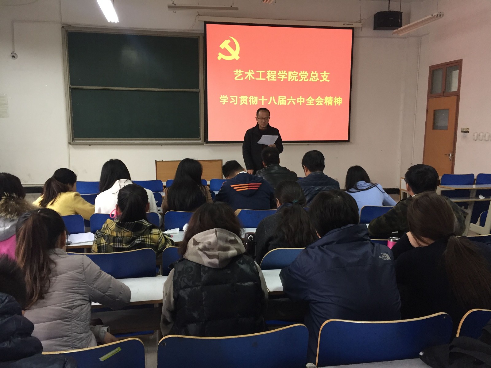 11月8日下午,艺术工程学院党总支在科技楼403教室召开全体党员干部会议,进一步贯彻落实“党的十八届六中全会精神”。会议由党总支书记时晓楠同志主持。